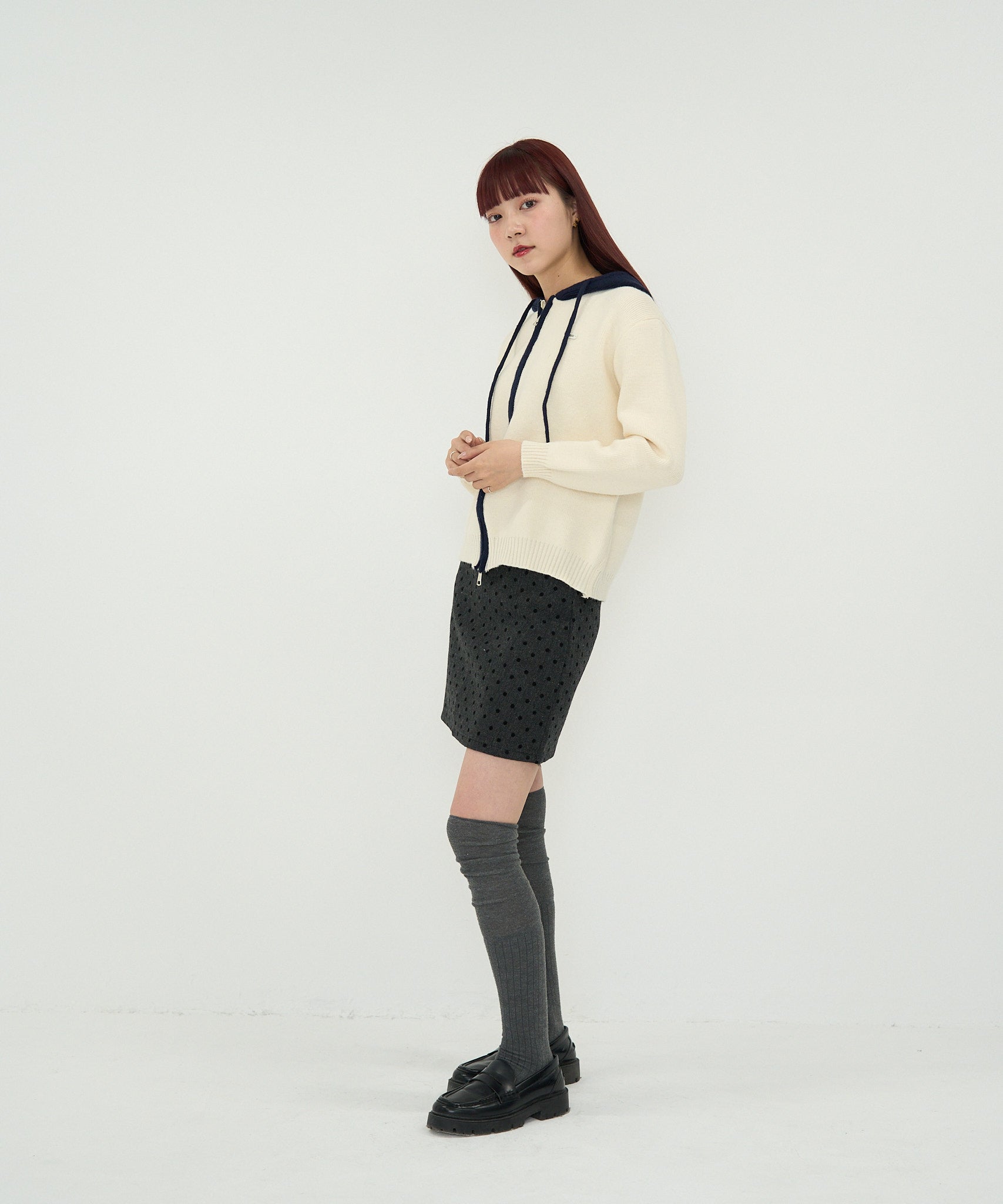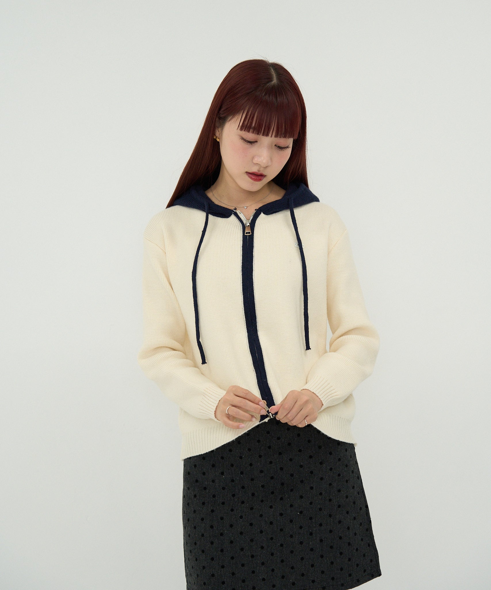 ダブルジップのニットフーディー。